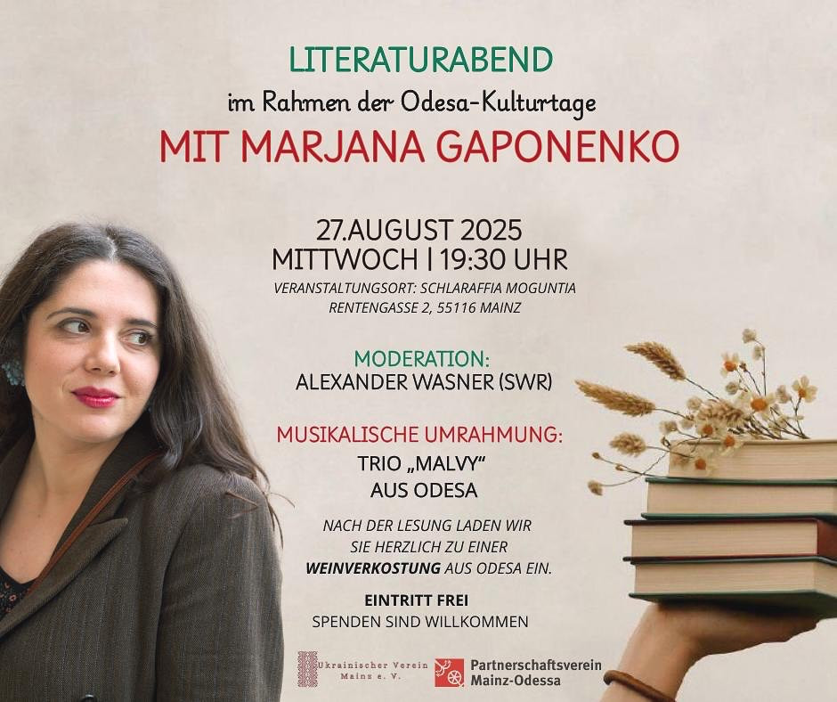 К Дням культуры Одессы украинская община в Майнце организовала литературную встречу с писательницей и поэтессой Марьяной Гапоненко, которая изучала германистику в Одессе и с раннего возраста начала публиковаться на немецком языке.